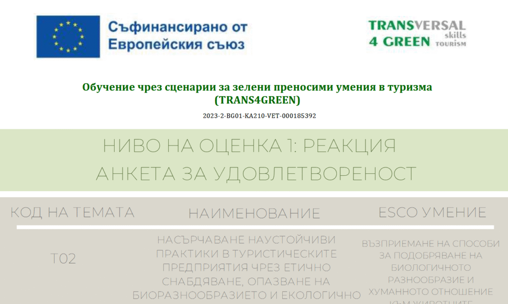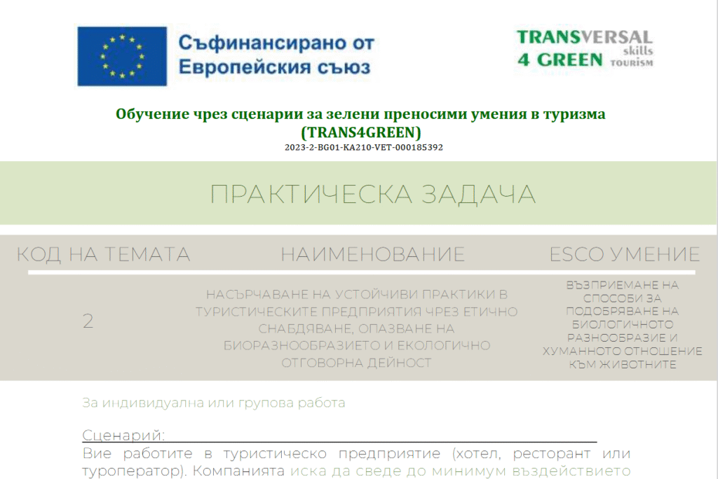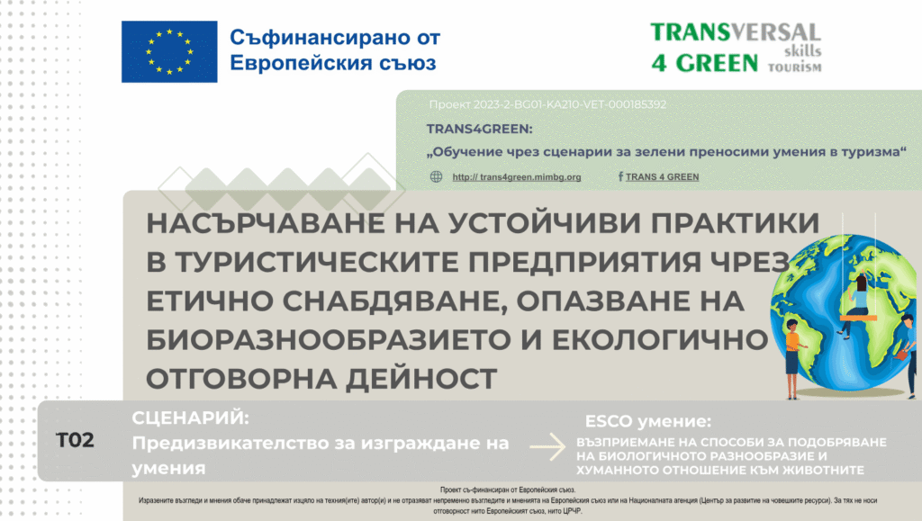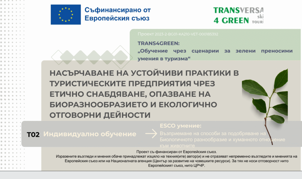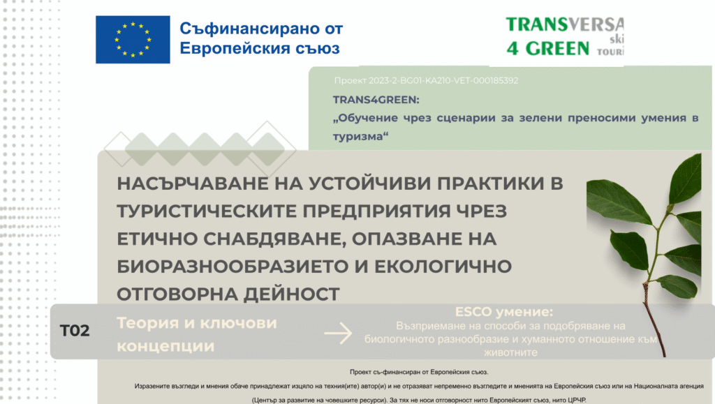 Насърчаване на устойчиви практики в туристическите предприятия чрез етично снабдяване, опазване на биоразнообразието и екологично отговорни дейности Ресурси Представяне Ресурси Сваляне Представяне Ресурси Сваляне Theory Presentation ToolBox Scenario Practical Task Individual Learning Assessment