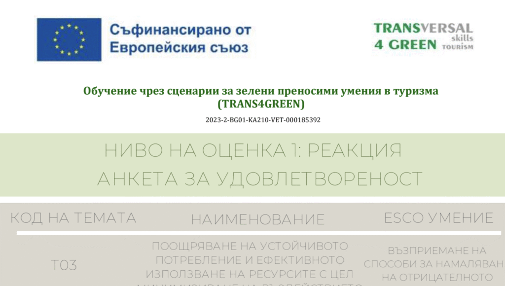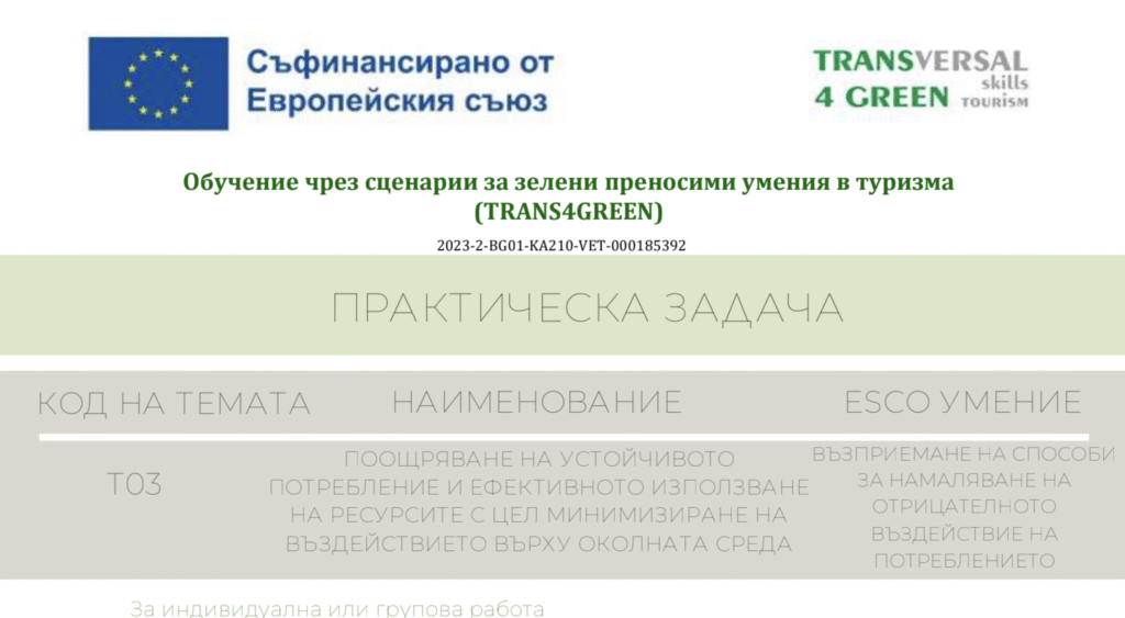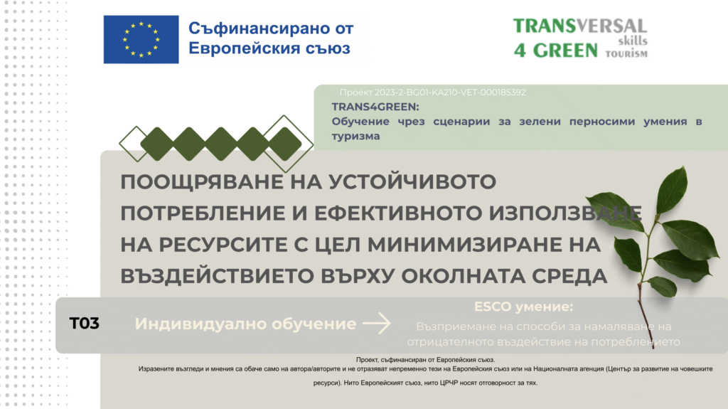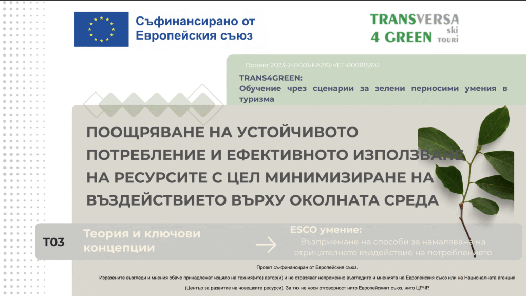 Поощряване на устойчивото потребление и ефективното използване на ресурсите с цел минимизиране на въздействието върху околната среда Ресурси Представяне Ресурси Сваляне Представяне Ресурси Сваляне Theory Presentation ToolBox Scenario Practical Task Individual Learning Assessment