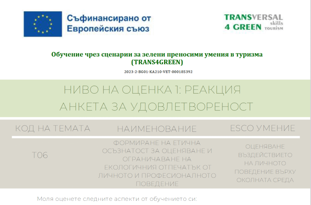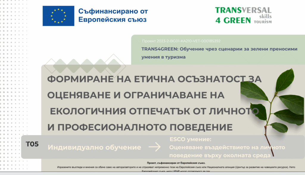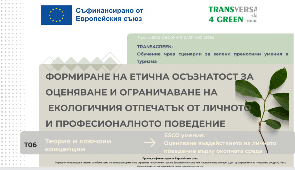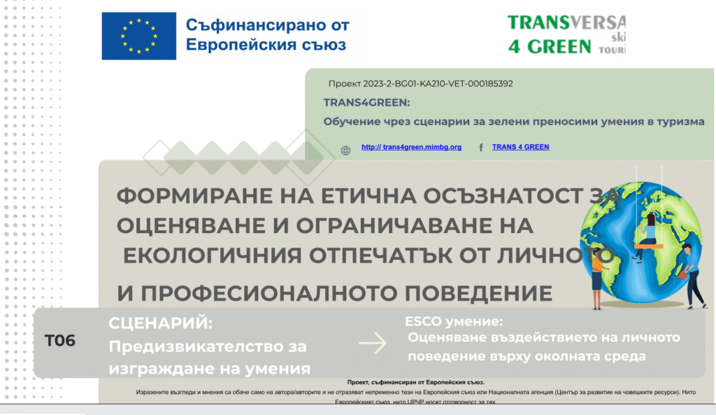 Формиране на етична осъзнатост за оценяване и ограничаване на екологичния отпечатък от личното и професионалното поведение Ресурси Представяне Ресурси Сваляне Представяне Ресурси Сваляне Theory Presentation ToolBox Scenario Individual Learning Assessment