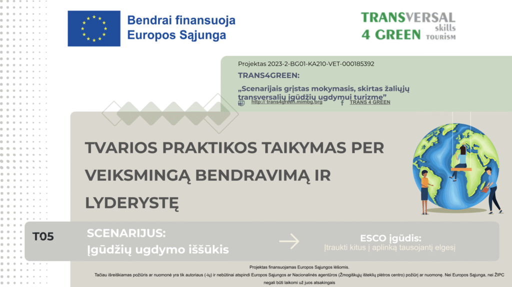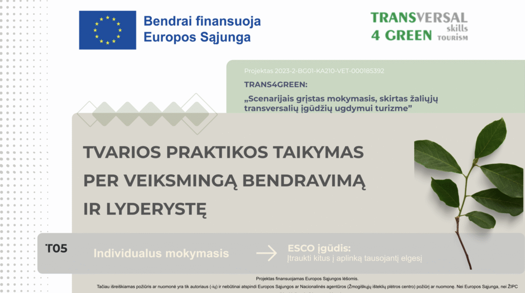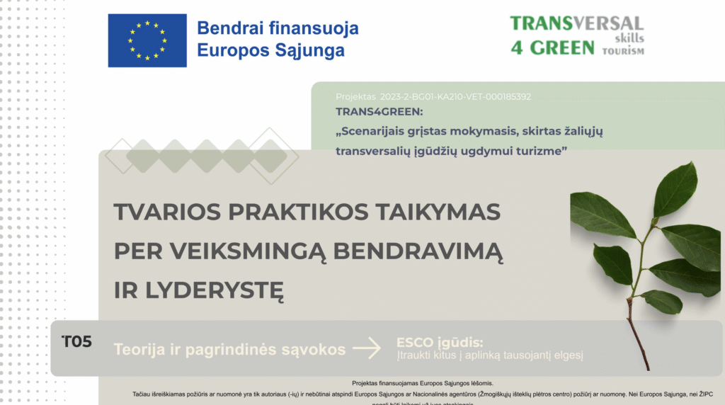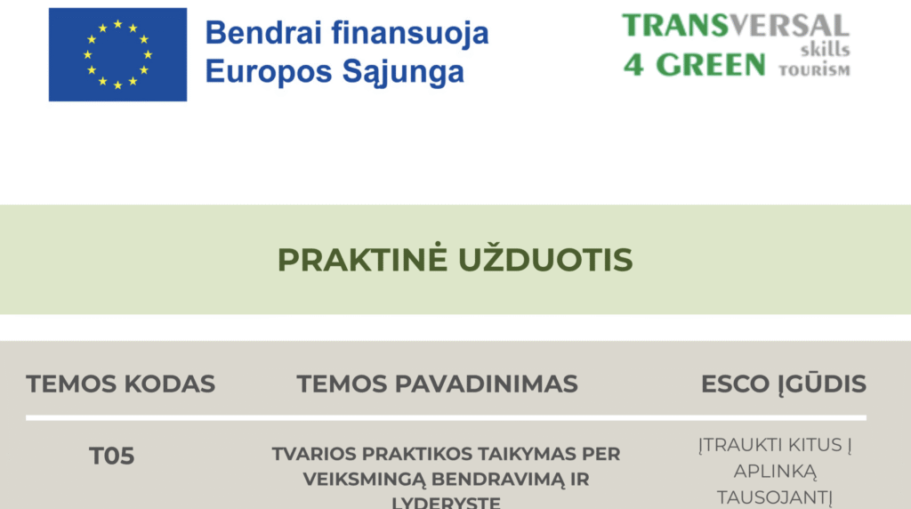Tvarios praktikos taikymas per veiksmingą bendravimą ir lyderystę Resources Intro Resources Downloads Intro Resources Downloads Theory Presentation ToolBox Scenario Practical Task Individual Learning Assessment